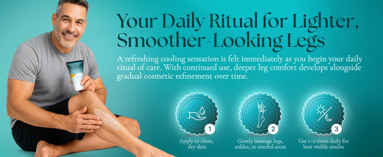 A refined daily ritual designed to support smoother-looking, more comfortable legs over time.